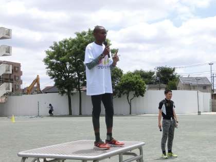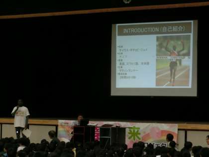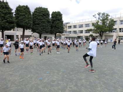 本日、子どもたちはオリンピックパラリンピック教育の一環として、夢・未来プロジェクトに参加しました。ゲストティーチャーには、マラソン選手のサイラス・ジュイさんに来ていただきました。2校時は全校児童でサイラスさんの講演を聞き、3・4校時は6年生が実技指導をしていただきました。子どもたちは、サイラスさんのマラソンに対する思いを一生懸命日本語で語ってくれる姿や、ものすごい速さで体育館や校庭を駆け抜けるプロの走り方に大変感動していました。