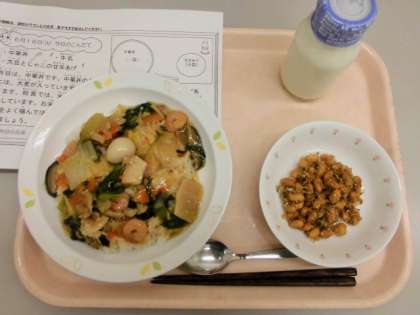 今日の給食は、中華丼、牛乳、大豆とじゃこの甘辛あげです。