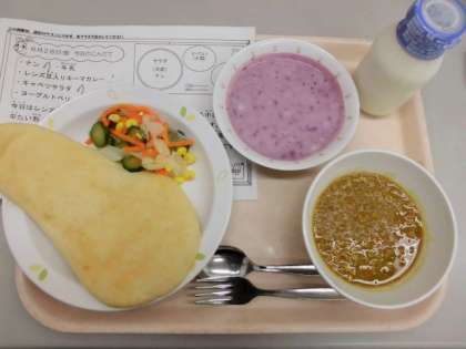 今日の給食は、ナン、レンズ豆入りキーマカレー、キャベツサラダ、ヨーグルトベリーソースがけです。