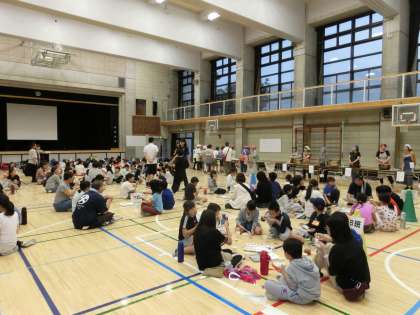 バケツリレーで楽しんだ後は、炊き出しのご飯とスープをいただきました。温かいご飯や飲み物をいただけることに感謝の気持ちをもつことができました。その後、学校探検で楽しんだ後就寝となりました。明日は6:00起床です。