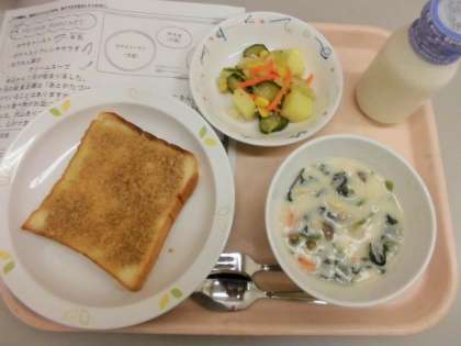 今日の給食は、セサミトースト、牛乳、ポテト入りフレンチサラダ、ほうれん草のクリームスープです。