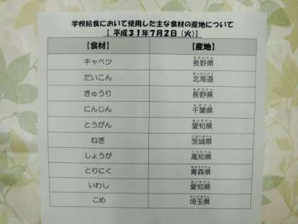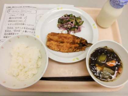 今日の給食は、ごはん、鰯のかばやき風、野菜のゆかりあえ、もずくと冬瓜の生姜たっぷり汁です。