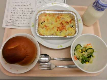 今日の給食は、黒砂糖パン、牛乳、マカロニグラタン、アスパラガスのサラダです。