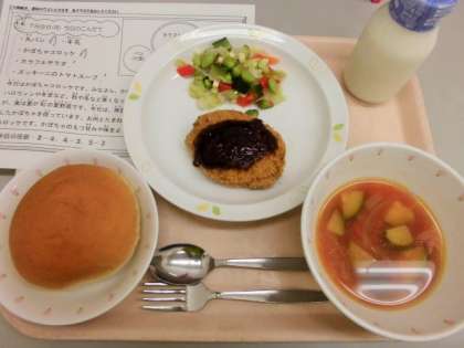 今日の給食は、丸パン、牛乳、かぼちゃコロッケ、カラフルサラダ、ズッキーニのトマトスープです。