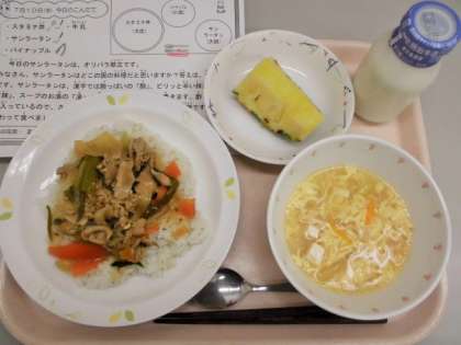 今日の給食は、スタミナ丼、牛乳、サンラータン、パインアップルです。