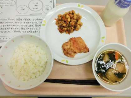 今日の給食は、ごはん、牛乳、ツナ大豆、鶏肉の照り焼き、すまし汁です。