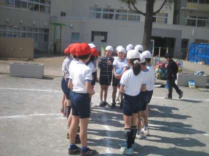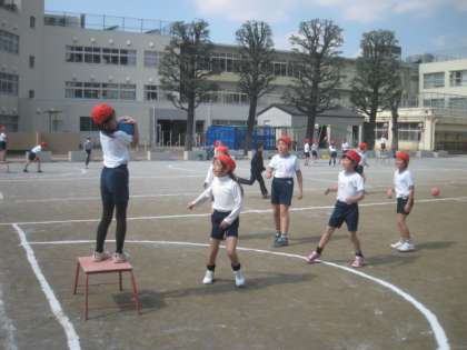 体育の授業でした。ポートボールです。チーム練習の時、声を掛け合って仲良くやっています。チームで競うことに楽しさを見出す年齢です。自分たちでゲームを進めてできるようになっていました。