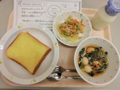 今日の給食は、はちみつレモントースト、牛乳、ツナと枝豆のサラダ、肉団子入り春雨スープです。