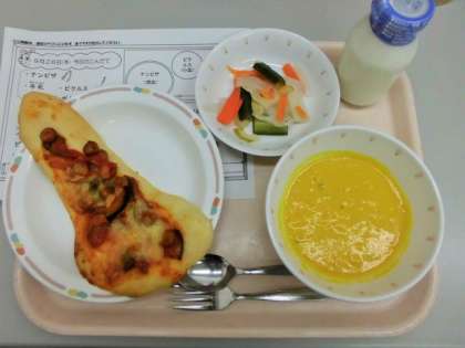 今日は、ナンピザ、牛乳、ピクルス、パンプキンポタージュです。