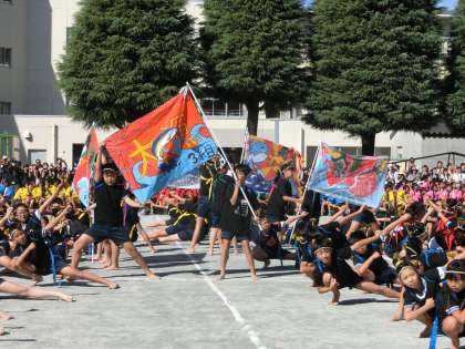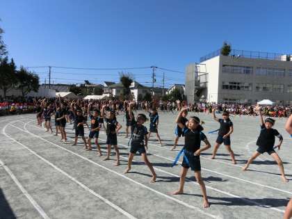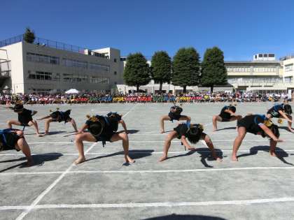 5年生の力強い「南中ソーラン〜RISING!〜」。腰も低く素晴らしい表現でした。