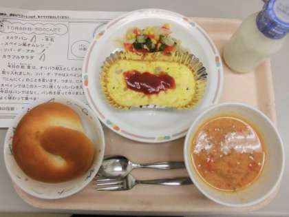 今日の給食は、ミルクパン、牛乳、スペイン風オムレツ、ソパ・デ・アホ、カラフルサラダです。