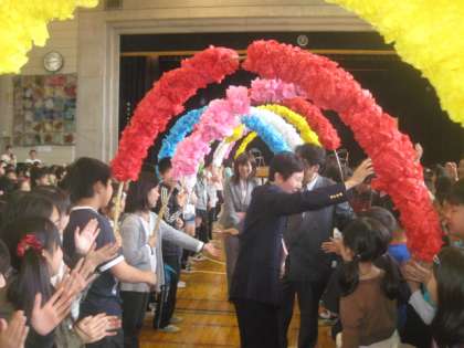 学校を去られた先生や主事さんとのお別れの式です。感謝の気持ちを込めて、さようならをしました。子どもたちは久しぶりに会った先生に大喜び。塚戸小学校の子どもたちは、素晴らしかった、頑張ってとエールを送って去って行きました。ありがとうございました。