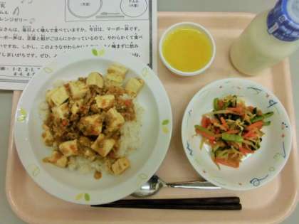 今日は、マーボー丼、牛乳、ナムル、オレンジゼリーです。