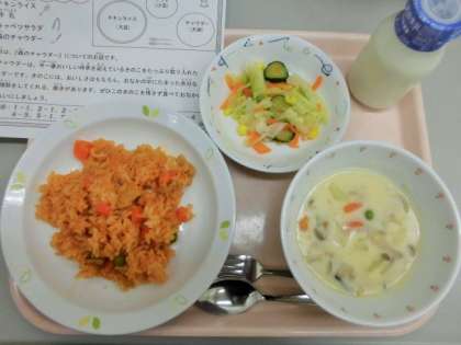 今日は、チキンライス、牛乳、キャベツサラダ、森のチャウダーです。