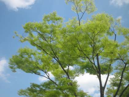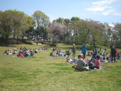 お弁当の時間です。グループごと、楽しく会食をしました。仲良しの3年生です。新緑の緑はきれいでした。