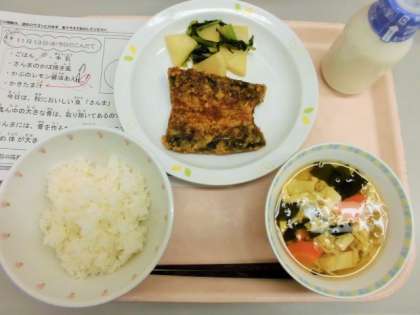 今日は、ごはん、牛乳、さんまのかば焼き風、かぶのレモンじょうゆあえ、かきたま汁です。