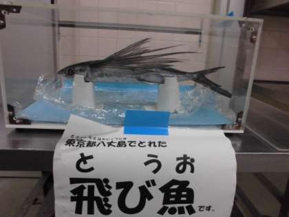 食育の日ということで、今日のシュウマイに使った飛び魚の実物を展示しました。