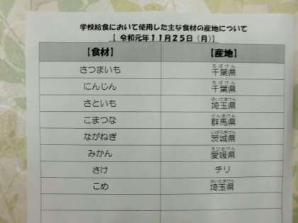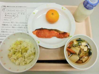 今日は、さつまいもごはん、牛乳、魚のもみじ焼き、けんちん汁、みかんです。