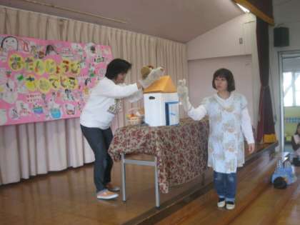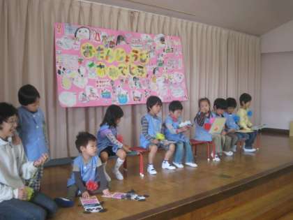 4月のお誕生日会。おめでとうございます。初めて、年少さんと年長さんがホールに集まりました。楽しいお誕生会でした。先生が人形劇の出し物をしてくれました。