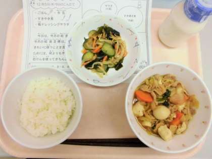 ごはん、牛乳、すき焼き煮、梅ドレッシングサラダです。