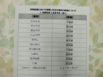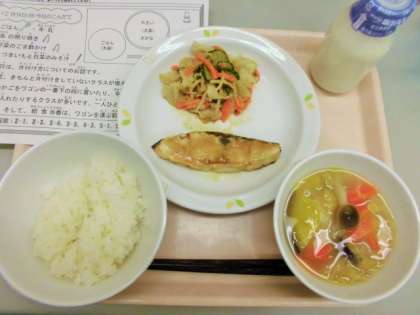今日は、ごはん、牛乳、魚の照り焼き、野菜のごま酢かけ、白菜とさつまいものみそ汁です。