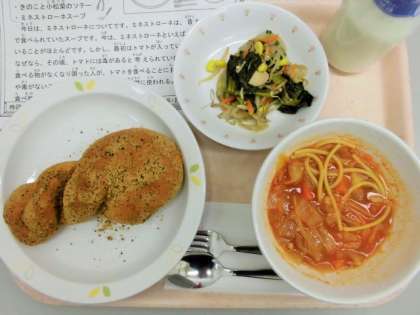 今日は、ごまきな粉あげパン、牛乳、きのこと小松菜のソテー、ミネストローネスープです。