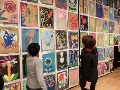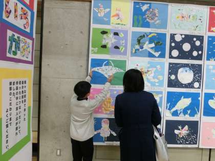今日は学習発表会(展覧会)の保護者鑑賞日です。朝早くからたくさんのお客様にお越しいただいています。それぞれの学年の展示場所には6年生によるミニ学芸員がいて丁寧に作品について解説をしています。
