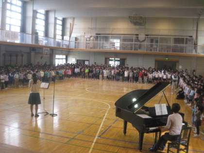 朝、体育館に全校児童が集まって、音楽朝会をしました。今日は、校歌と、5月の歌を歌いました。全校児童980名の声がこだますと素敵です。気持ちよい朝の時間でした。