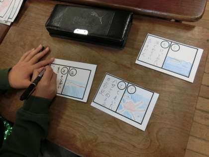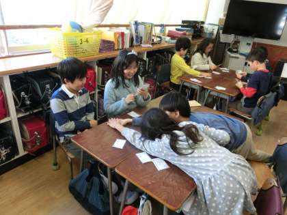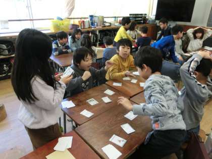 今日3年生は国語「カルタを作ろう」の学習をしました。それぞれの班が作るカルタのテーマを決め、海に関するもの、国や地域のカルタなどなど、それぞれが挿絵も工夫して作成していました。完成したらみんなでカルタ取り!とっても楽しそうに取り組んでいました。