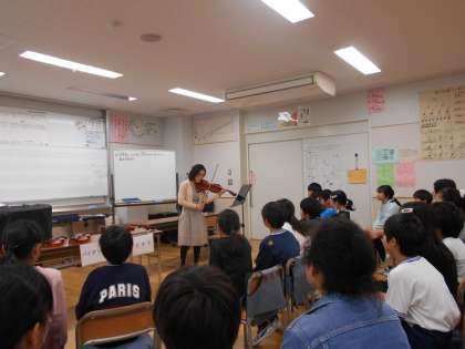 始めに「情熱大陸」を演奏していただき、バイオリンの音色に引き込まれていました。また、バイオリンの構造や演奏の技法について教えていただきました。