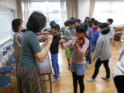 バイオリンやビオラ、チェロの演奏体験では、子どもたちは熱心に取り組み、音が出たことを喜ぶ姿が見られました。