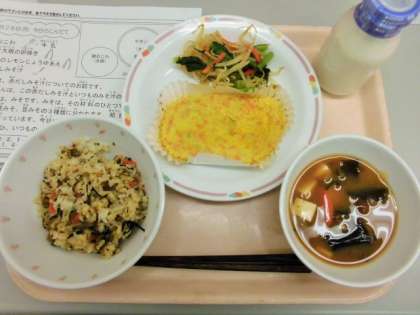 今日は、磯おこわ、牛乳、切り干し大根の卵焼き、野菜のレモンじょうゆあえ、赤だしみそ汁です。