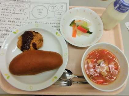 今日は、黒砂糖パン、牛乳、こまったさんのコロッケ、ピクルス、トマトとエリンギのスープです。
