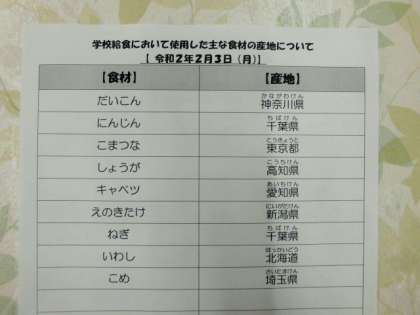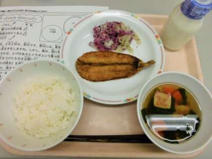 今日は、ごはん、牛乳、鰯のかば焼き風、野菜のゆかりあえ、節分汁です。