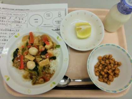 今日は、中華丼、牛乳、大豆とじゃこの甘辛揚げ、はるか(柑橘類の一種)です。