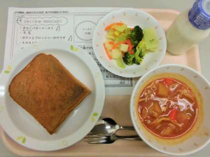今日は、きなこバタートースト、牛乳、ポテトとブロッコリーのサラダ、ミネストローネスープです。