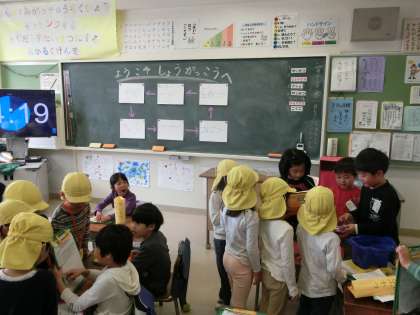今日は幼保小交流会がありました。午前中は雨模様でしたが、千歳保育園、千歳なないろ保育園、つくしんぼ保育園、祖師谷保育園、上祖師谷保育園、祖師谷保育園分園の園児のみなさんが元気に塚戸小学校に来てくれました。1年生のクラスごとに、掃除の仕方の実演や学習する内容の紹介など、小学校はこんなところだよ!という説明を一生懸命にしていました。もうすぐ春、4月の入学が楽しみですね!