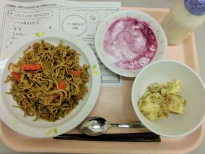 ソース焼きそば、牛乳、じゃがいもの香味和え、ヨーグルトベリーソースがけです。