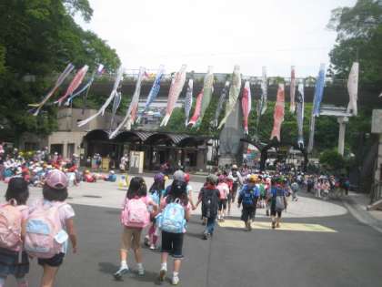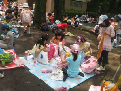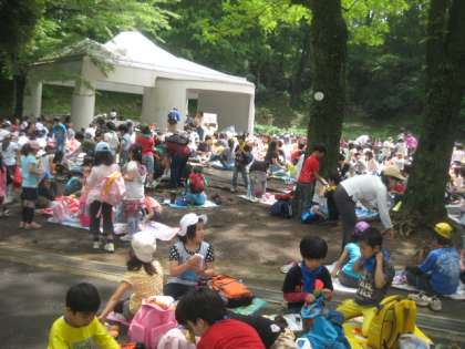 はやし広場でお弁当。とっても混んでいました。グループで楽しく食べました。午後は、とても暑くなり、疲れたようでした。でも、楽しかった遠足でした。