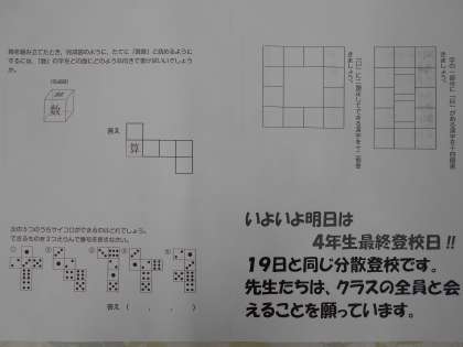 臨時休校、時差登校のため明日も揃って会うことが難しくとても残念ですが、気持ちよく進級できるよう時間に気を付けて来てください。