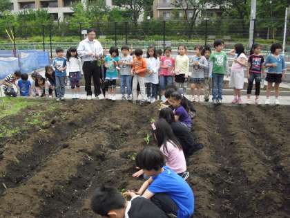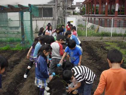 2年生は生活科の学習で、学校の目の前にある畑へ出かけ、サツマイモの苗の植え付けを行いました。植え付けと水やりの分担をしながら、子どもたちは土の感触を確かめながら楽しそうに作業に取り組んでいました。秋の収穫が今から楽しみです。