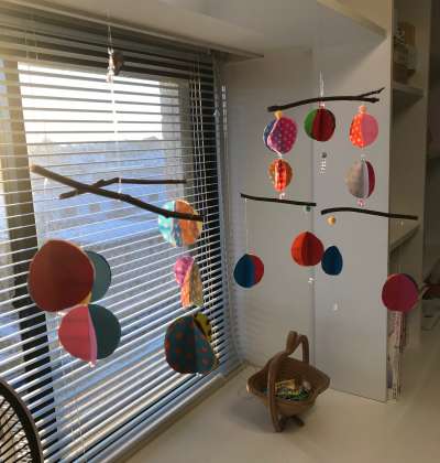 色がとてもきれいでまりのようですね。モビールの棒も木の枝を使っていて、とても良い工夫です。バランスをとるのが難しいモビールを何段も積んでいるのがすごい!これからの季節、風にゆらゆら揺れて涼しい気持ちにもさせてくれそうなきれいな作品です。
