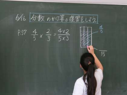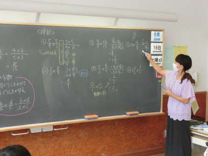 分数×分数や分数÷分数はとても難しい学習の1つです。なぜなら、頭の中でイメージがしにくいからです。3+5や3×5のような学習では実物を使って計算することができます。6年生の先生方は、難しい計算の仕方を図を使って丁寧に説明をしていました。