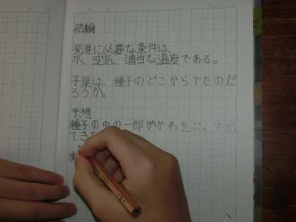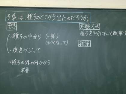 5年生の理科では「子葉は、種子のどこから出たのだろう」という学習課題から予想を立てたり、解決方法を考えたりしていました。ノートのとり方もとても丁寧でした。