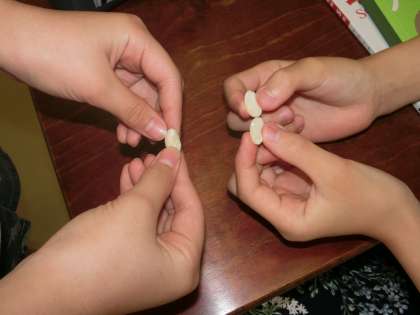 学習の最後に、先生からインゲンマメの種が配られ、じっくり観察していました。