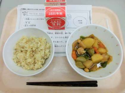 今日は、生姜とじゃこのごはん、牛乳、豆入り筑前煮です。