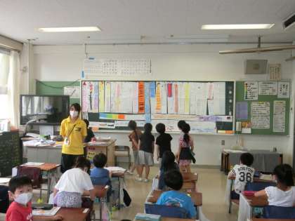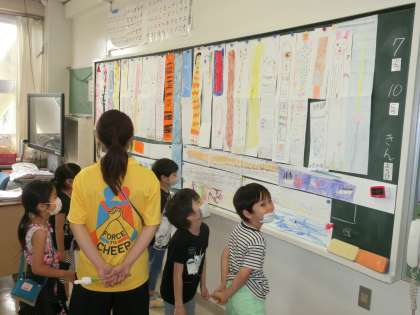 1年生の教室をのぞくと、図工の作品紹介をしていました。「ながーい かみから」という学習で、長方形の画用紙に思い思いの絵を描きました。動物もいれば、乗り物など、子どもたちの自由な発想が存分に生かされた学習となりました。鑑賞の態度も立派になりました。