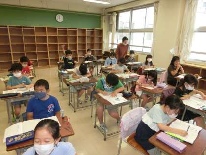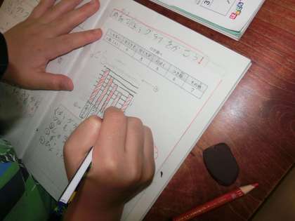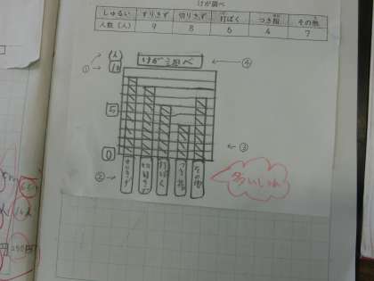 3年生の算数では棒グラフに取り組んでいました。けがの種類とけが人の数をぼうグラフに表すことによって、一目でわかりやすくなりました。一人一人、定規を使って丁寧に取り組んでいました。丁寧さは算数でも大切なことです。