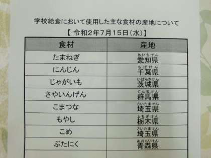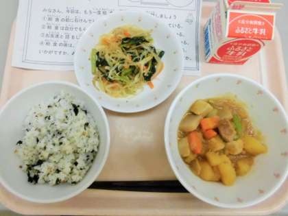 今日は、わかめごはん、牛乳、肉じゃがうま煮、華風和えです。
