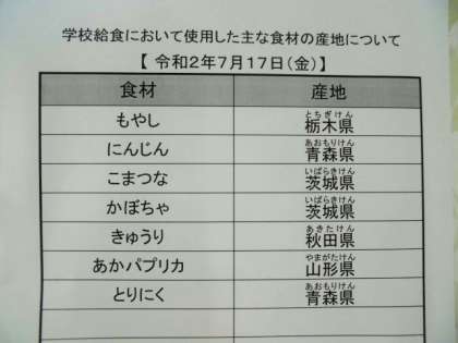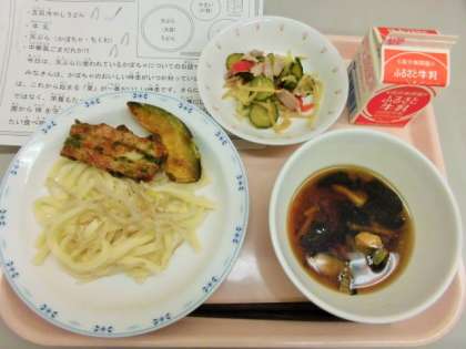 今日は、五目冷やしうどん、うどんつゆ、牛乳、天ぷら(ちくわ・かぼちゃ)、中華風ごまだれかけです。